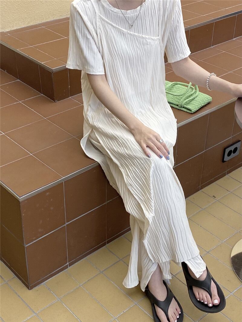 2022夏INS 新作】気質 スリット フェイクレイヤード ロングワンピース/ハイウエストカジュアルパンツ
