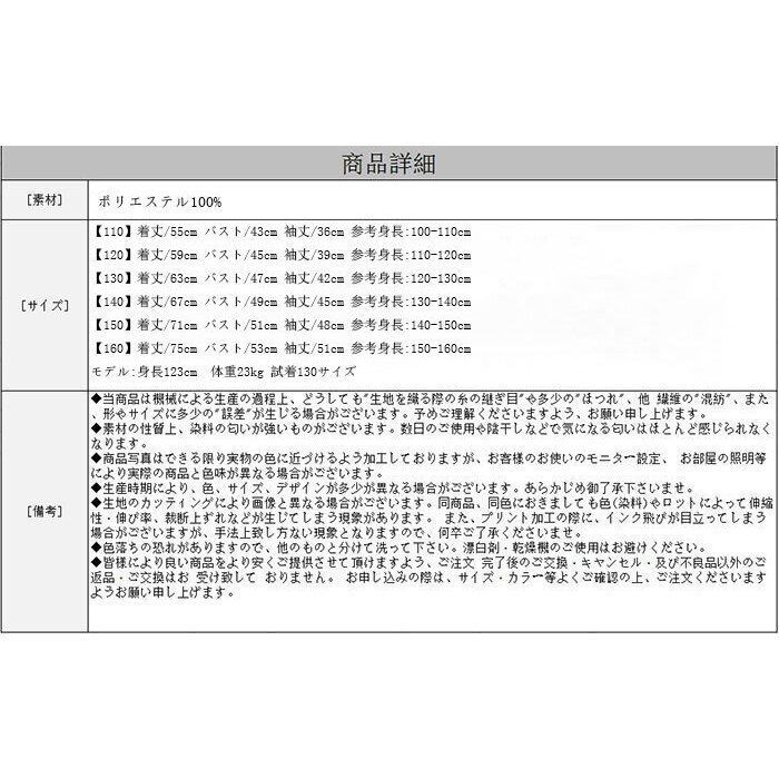 【商品コード】y603542【素材】生地:ポリエステル100%【カラー】 写真通り【サイズ】【110】着丈/55cm バスト/43cm 袖丈/36cm 参考身長:100-110cm【120】着丈/59cm バスト/45cm 袖丈/39cm 参考身長:110-120cm【130】着丈/63cm バスト/47cm 袖丈/42cm 参考身長:120-130cm【140】着丈/67cm バスト/49cm 袖丈/45cm 参考身長:130-140cm【150】着丈/71cm バスト/51cm 袖丈/48cm 参考身長:140-150cm【160】着丈/75cm バスト/53cm 袖丈/51cm 参考身長:150-160cmモデル:身長123cm 体重23kg 試着130サイズ注意事項:※ 平置き素人採寸ですので多少の誤差はご容赦下さい。※ モニタ環境によって、商品の色合いが多少違う場合があります。※ 少々匂いがありますが、置いたままで2-3日くらいになくなりますので、ご安心ください。※ 発送時も簡易梱包の為、お