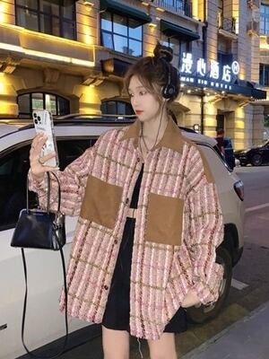 アンティーク調/ツイード/編み/若い女性/アウターウェア/女/初秋/新しいデザイン/気質/スプライシング/ルース/中長スタイル/トップス