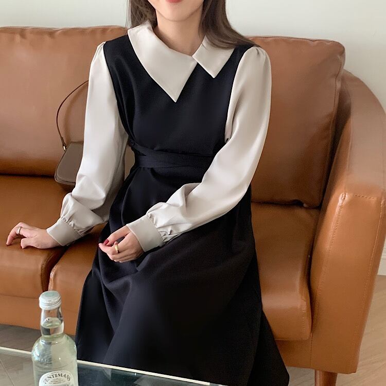 全2色 長袖ワンピース フリル 切り替え バイカラー スリム 着痩せ sweet系