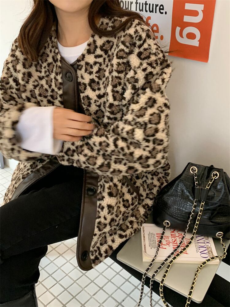 コート 怠惰な風 ヒョウ柄 子羊の毛 縫付 レザー ゆったりする コットン