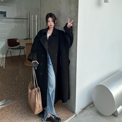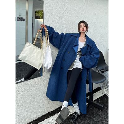 ダブルブレスト/長袖/スーツの襟/ブルー/毛皮/一体/アウターウェア/女/冬/中長スタイル/ルース/手厚い/羊毛の/アウターウェア